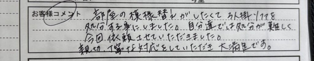 「部屋の模様替え出したくて3人掛けソファーを処分することにしました。自分たちでは処分が難しく今回依頼させていただきました。親切 丁寧な対応していただき大満足です。」