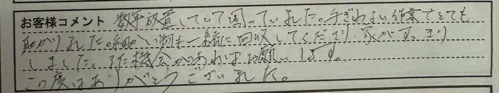 【数年放置していて困っていました。手ぎわよい作業でとても助かりました。細かいの物も一緒に回収してくださり、家がすっきりしました。また機会があればお願いします。この度はありがとうございまいた。】