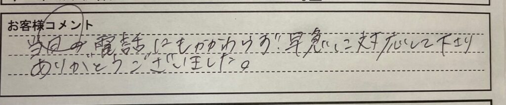【当日のお電話にもかかわらず、早急に対応して下さりありがとうございました。】